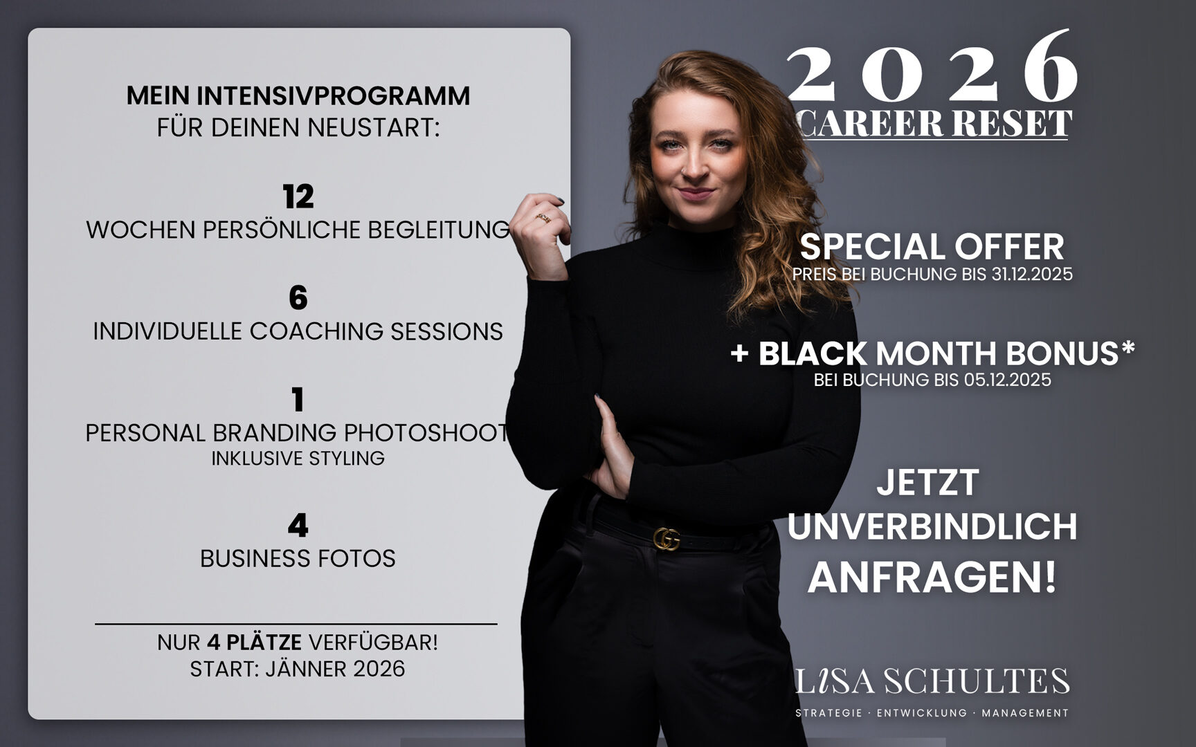 Informiere dich jetzt und sichere dir deinen *Black Month Bonus bei Buchung bis 05.12.: wahlweise 30-minütige Analyse-Session für CV, LinkedIn oder Website – du entscheidest.